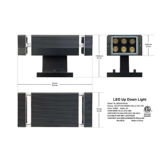 LED Wall Light Up Down Wall Light 100-277V 12W 3000K(Warm White), PL-UPD-6X1M-2S