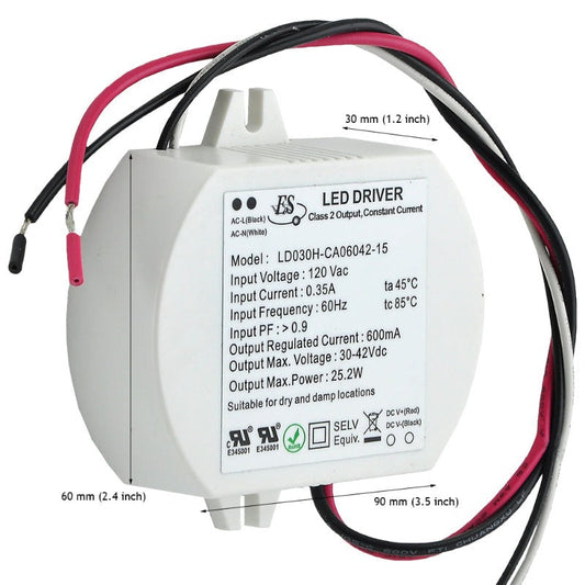 Non-Dimmable Constant Current LED Driver 25.2W 600mA 30-42V, ES LD030H-CA06042-15 = LD030D-CA06045-15Regular price $44.00 USDRegular priceUnit price / per-