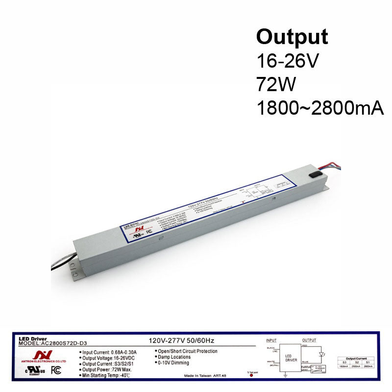 - The ANTRON AC2800S72D-D3 is a constant current LED driver that offers selectable current options of 1800mA, 2500mA, and 2800mA.